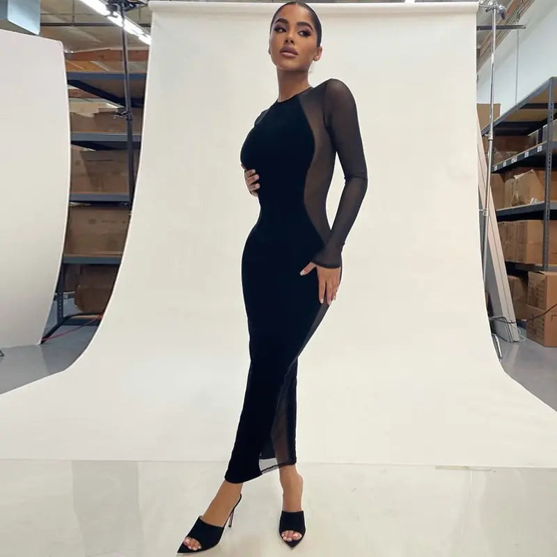 Autumn Winter Sexy See-through Mesh Long Sleeve Dress