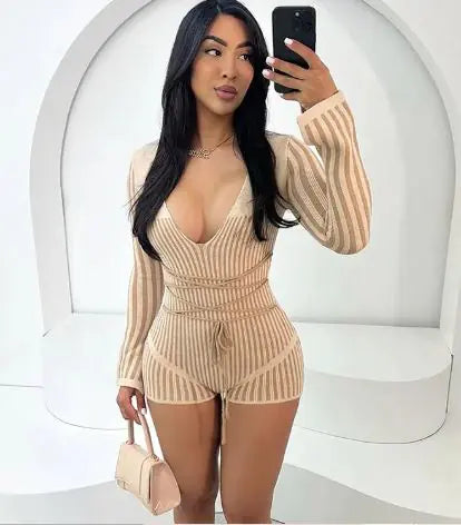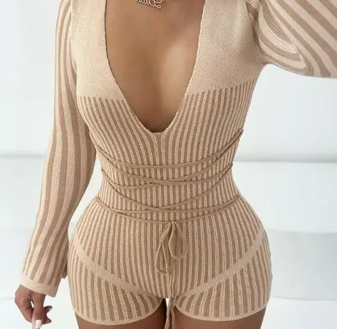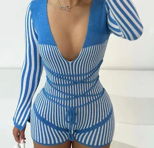 Sexy Striped Knitted Deep V-Neck Romper Luxesai