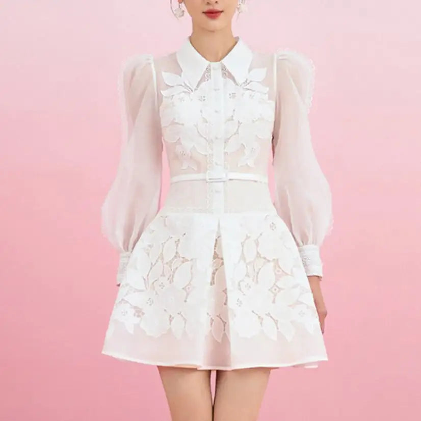 Elegant White Floral Embroidered Long Sleeve Mini Dress