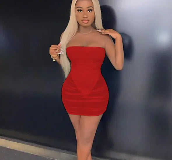 Turn heads with this Mesh Pleated Tube Top Dress, featuring a chic wrapped design with a stylish see-through effect. This dress combines elegance with a hint of allure, thanks to its layered mesh and pleated details. Perfect for evening events or nights out, it offers a flattering fit that’s both comfortable and eye-catching.