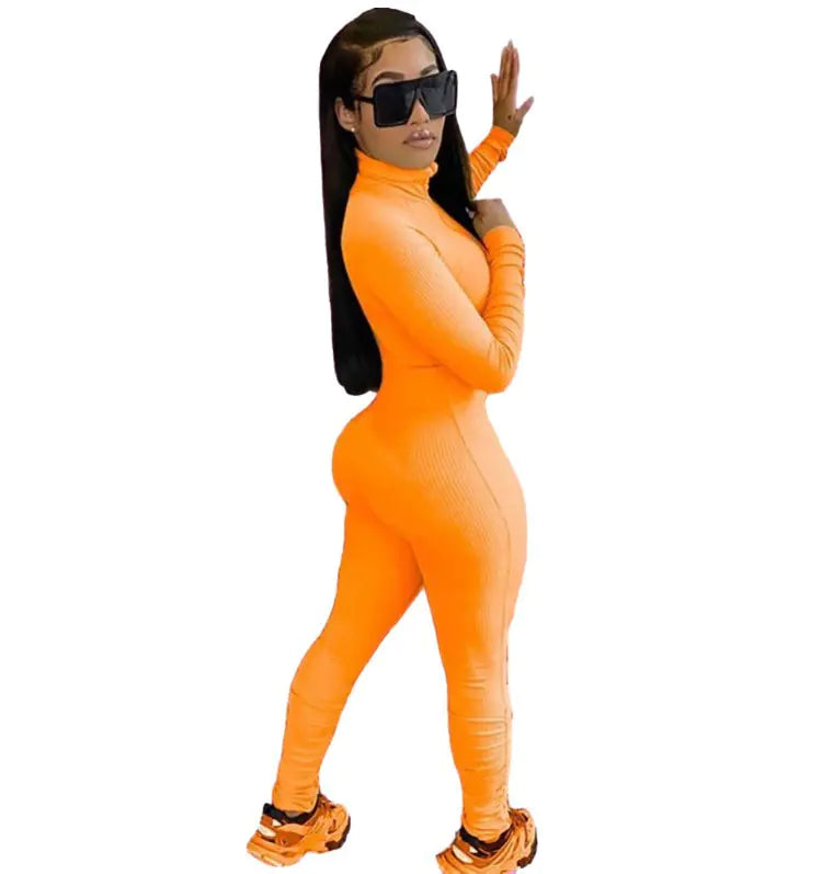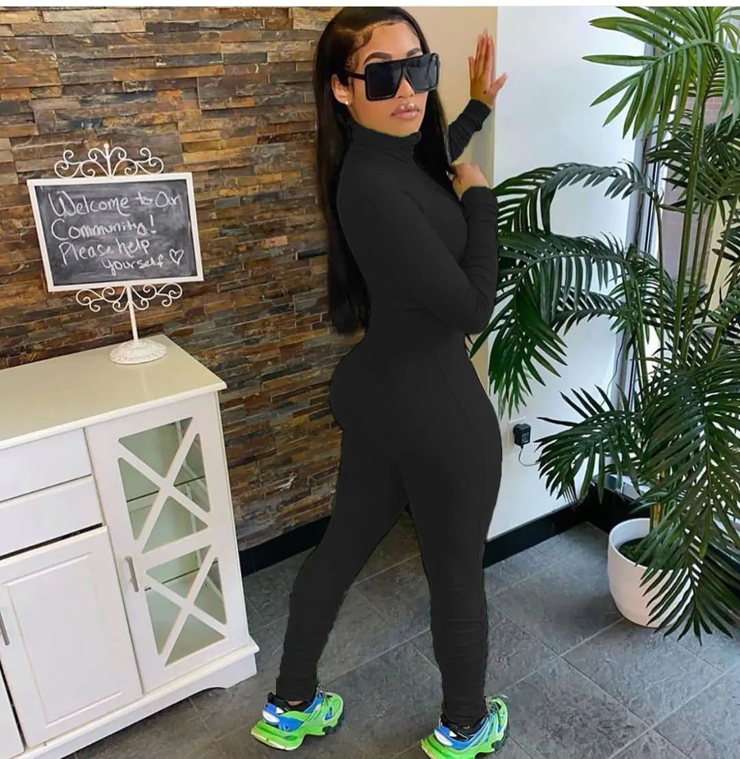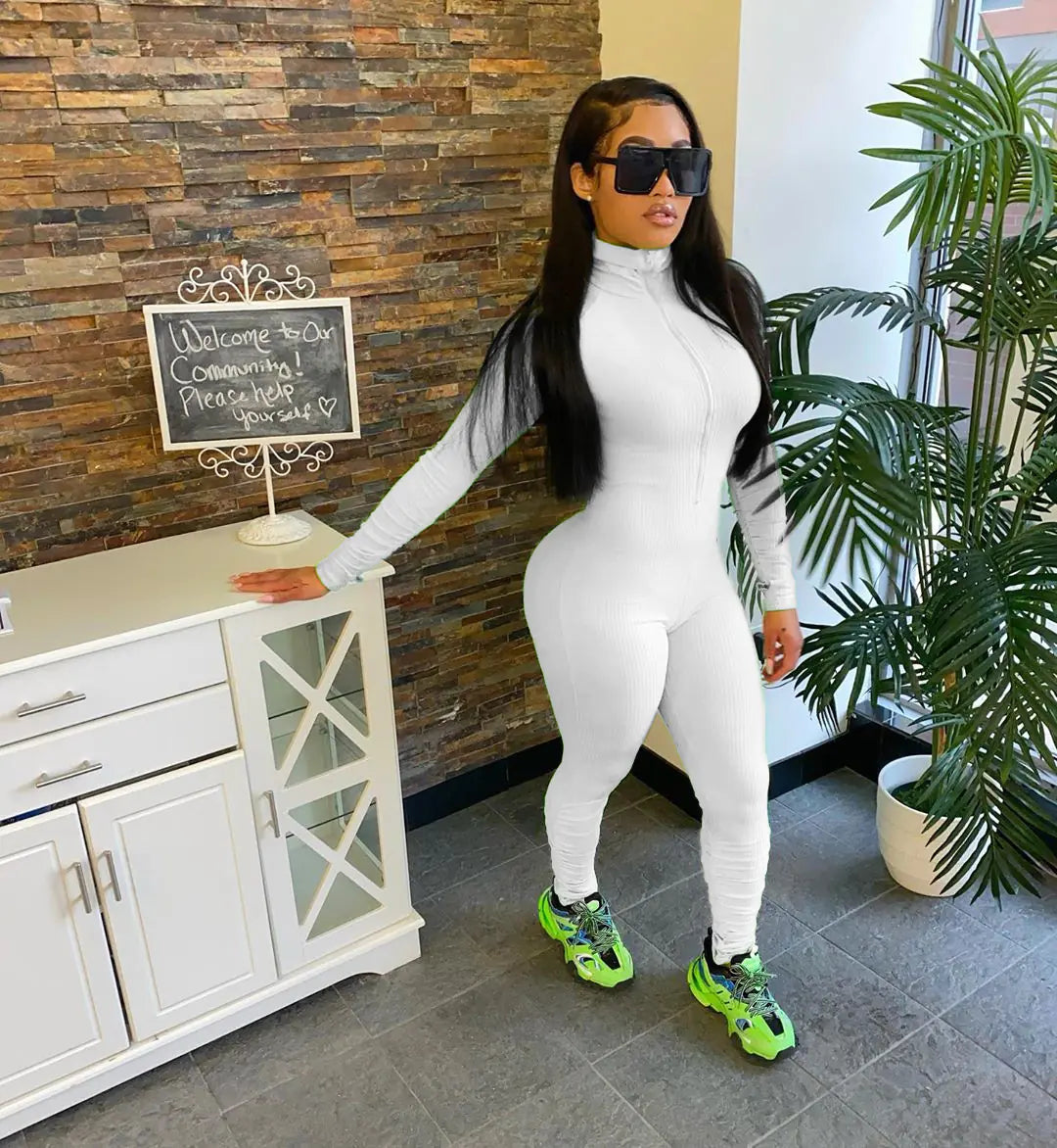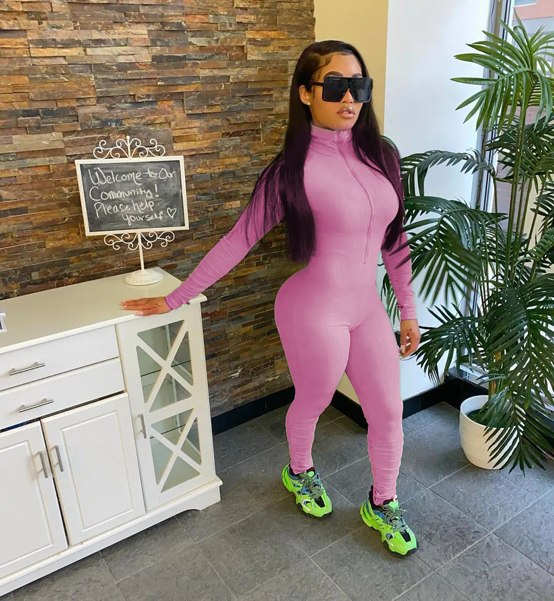 Ribbed Long Sleeve Zip Up Bodycon Jumpsuit