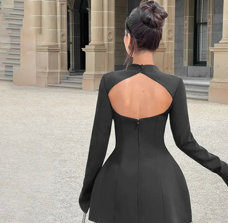Black Mock Neck Long Sleeve A-Line Mini Dress - Open Back