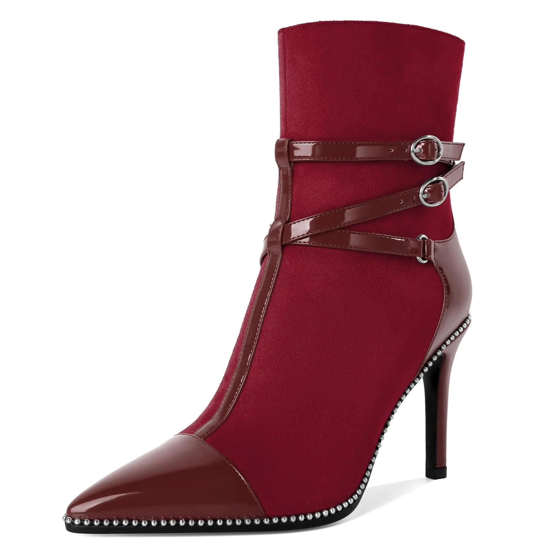 [【Heel Height】Stiletto high heel ankle boots are designed with a heel height of 9.5cm/4 inches which can elongate your legs. Perfect shaft height frames your leg so that these booties look eye-catching with any dresses and skirts. "【Fashion Design】These ankle boots feature a sophisticated aesthetic with a pointed toe and beaded embellishments adding a touch of refinement to any outfit. The upper is decorated with 3 delicate buckle strap everywhere shows your sexy and beauty. Their timeless design ensures theyre a go-to staple in any fashion-forward collection." 【High Quality Materials】Carefully crafted from quality faux suede and patent leather material these short booties ensure durability without compromising on style. Buckled strap booties feature a comfortable cushioned insole that snuggles your feet to provide comfort with every step. A sturdy outsole ensures maximum comfort through prolonged wear. "【Easy On and Off】Flaunt your flawless style as you slip into these womens ankle boots and booties. With side zipper closure these boots offer a secure and adjustable fit so you can focus on enjoying your day or night out. The buckle strap is designed to adjust the elasticity of the boot shaft." 【Multi Occasions】These ladylike mid-calf boot for women will make you shine among the crowd wearing it and enjoy yourself at night out party prom wedding anniversary music festival work date and any other occasions. Perfect for wearing with casual style dress shorts jeans pants etc.]